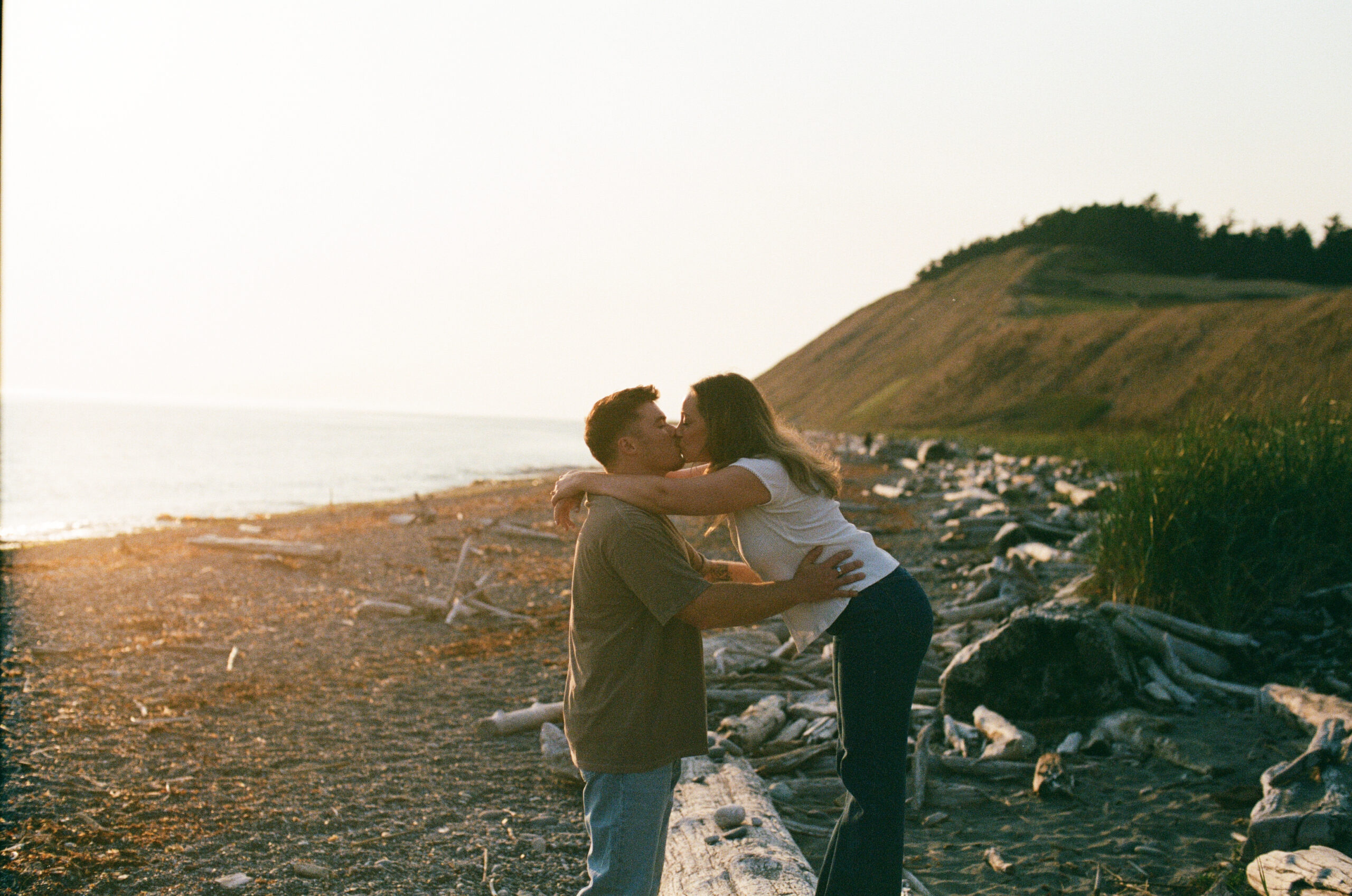 Digital and film golden hour engagement photos at Ebey’s Landing with Ellie and Decker—a dreamy Whidbey Island session filled with soft light & ocean views.