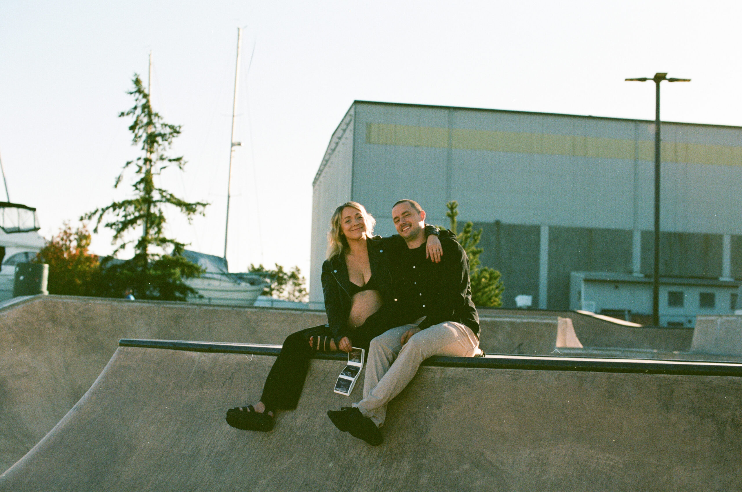 Nick and Kami’s skate park maternity announcement—a playful and effortlessly cool session captured both on digital and 35mm film.